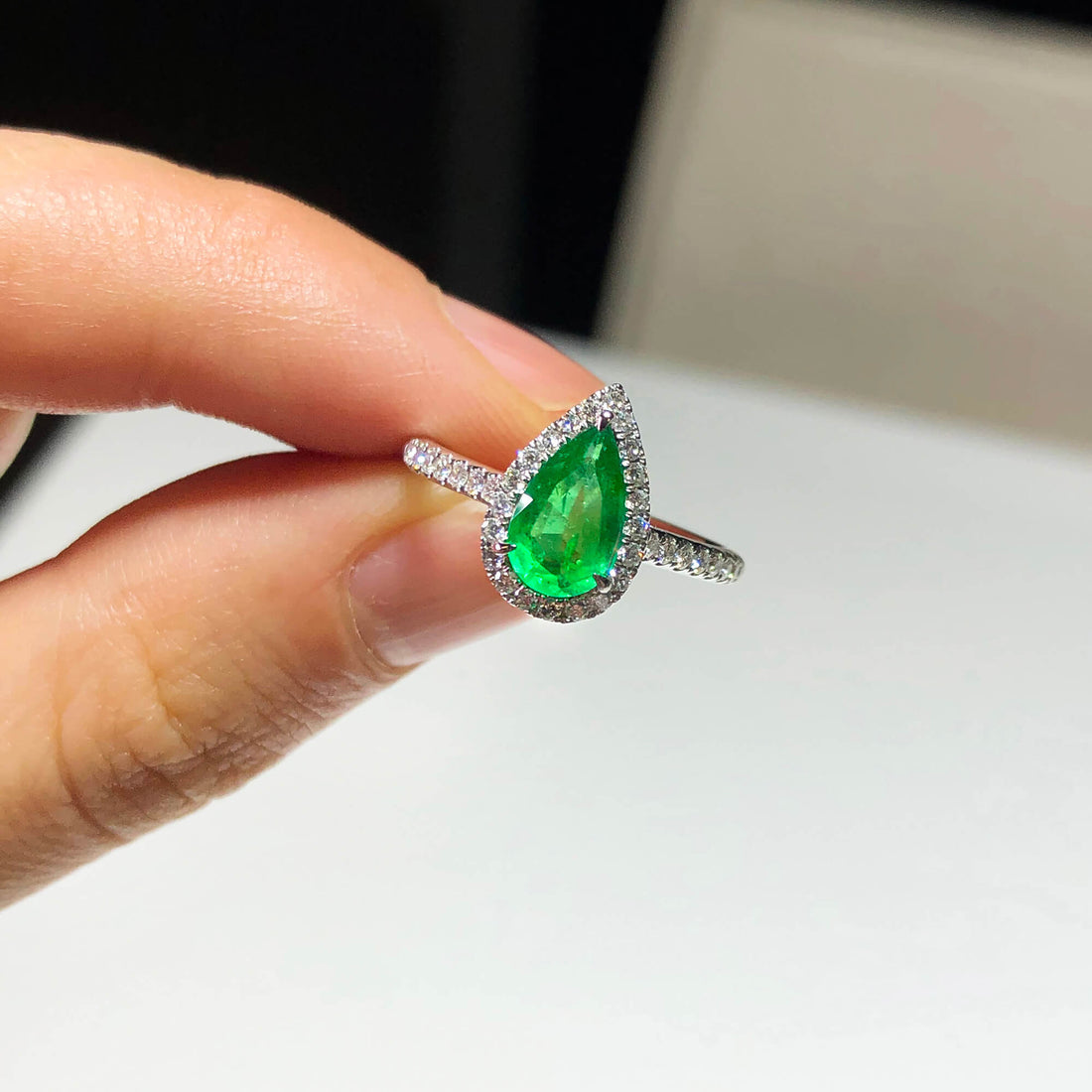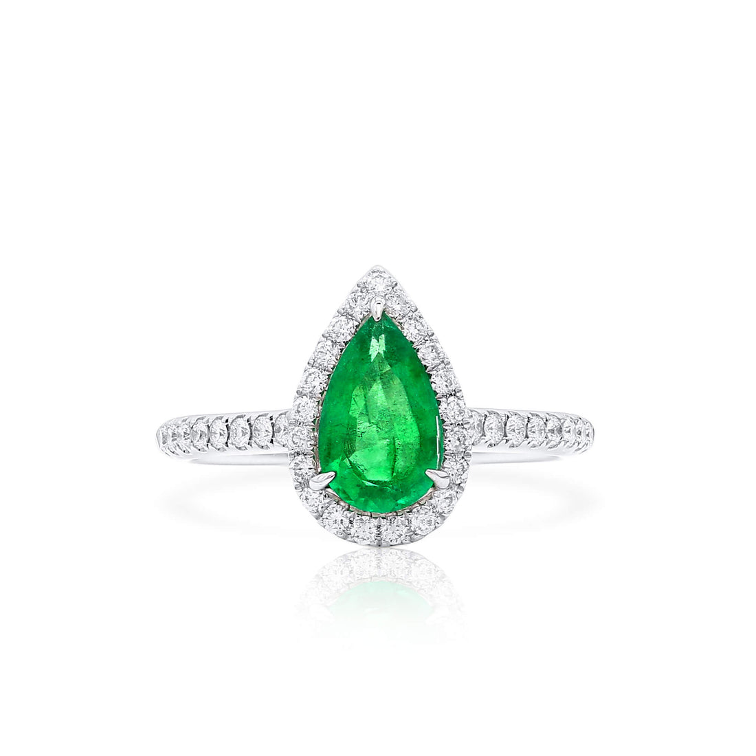 - Main stone weight of 0.83 carats, featuring a stunning green pear-shaped emerald