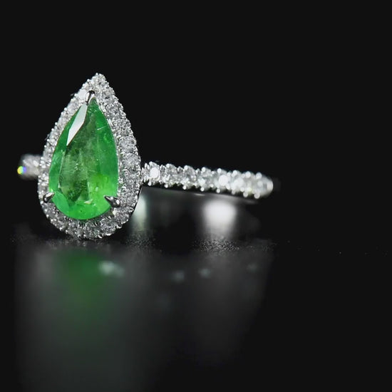 Natural Green Colombian Emerald Halo Ring 18K White Gold, Pear Shape, 1.11 Ct. TW