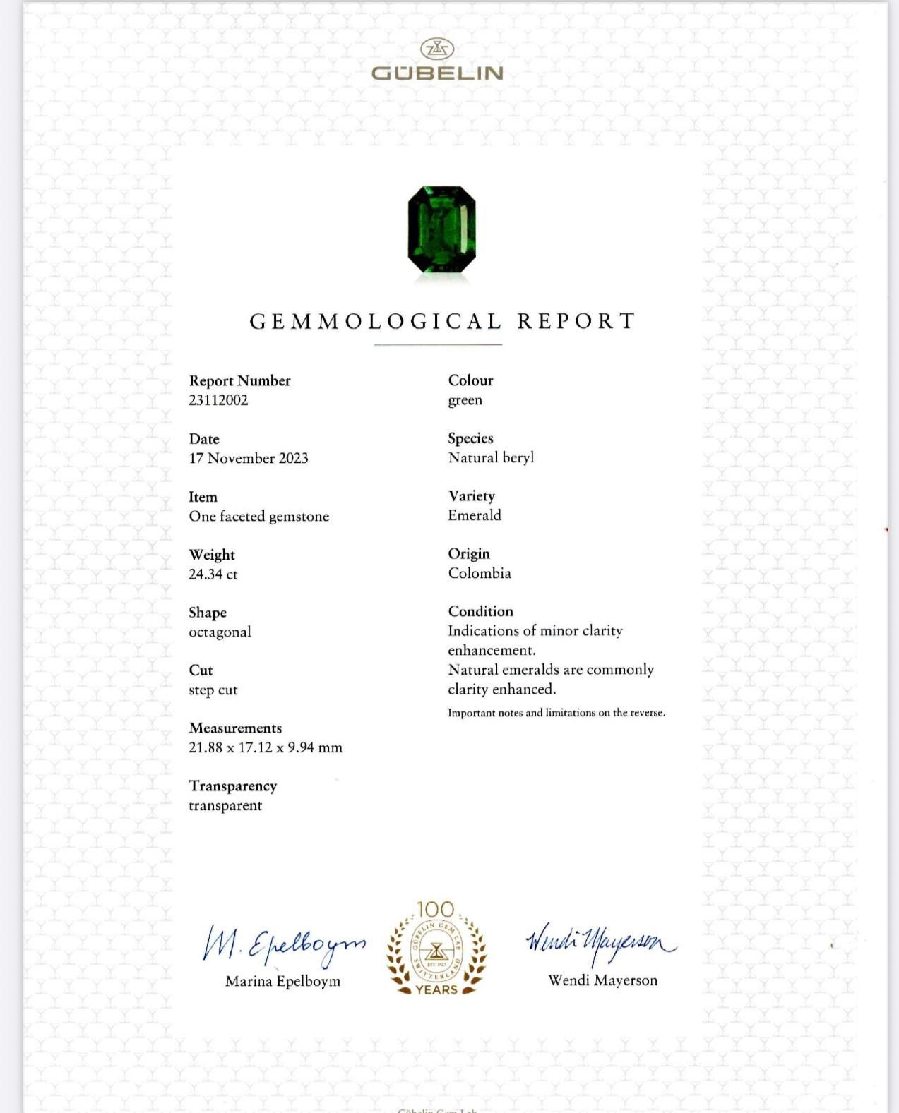 Natural Green Colombia Emerald Ring, 26.46 Ct. TW, Radiant shape, GUBELIN Certified