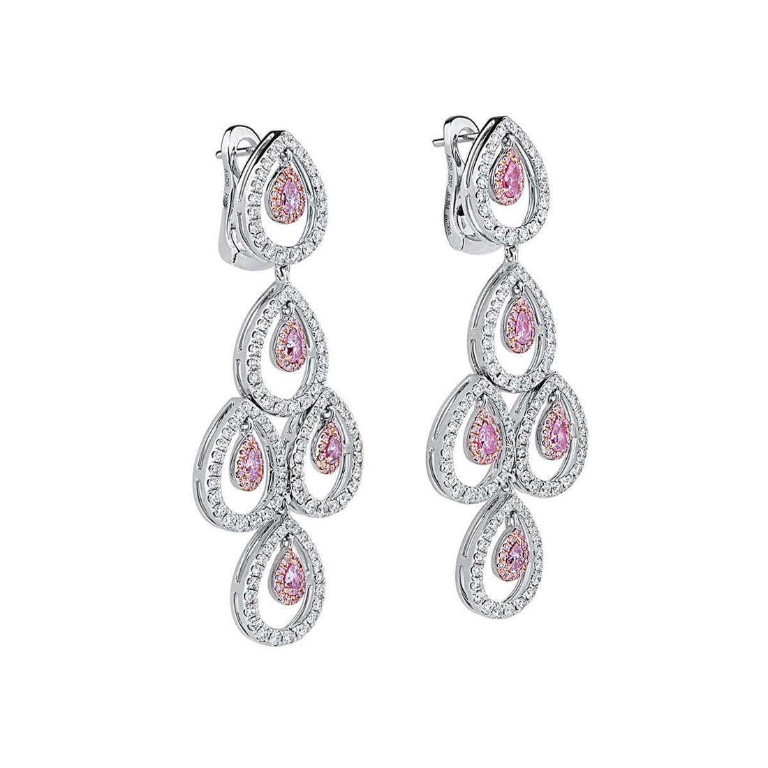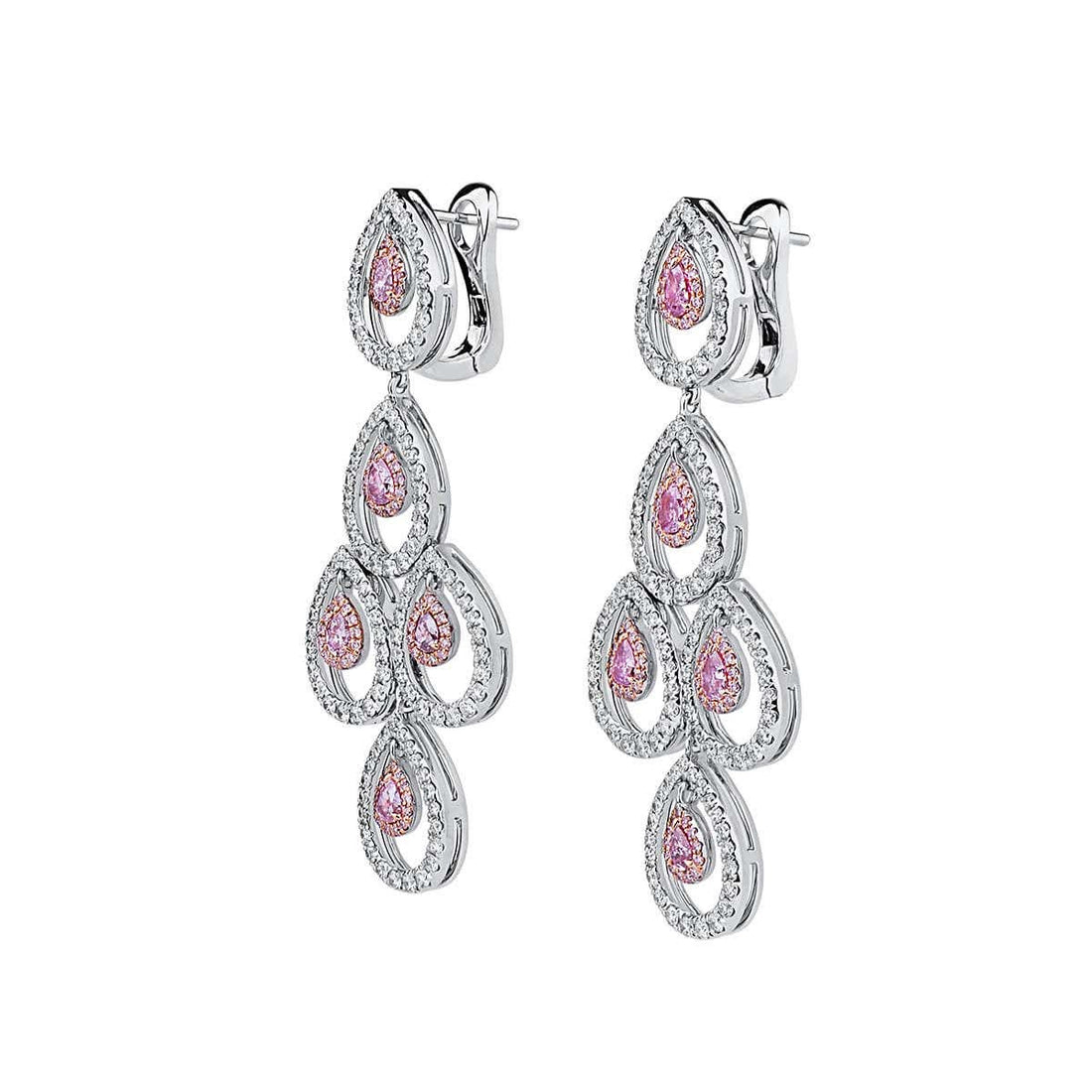 Natural pink and white diamond chandelier earrings in 18K white gold, totaling 2.90 ct TW.