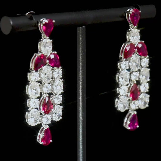 Natural Diamond and Vivid Red Ruby Chandelier Earrings 18K White Gold, Pear Shape, 9.51 Ct. TW