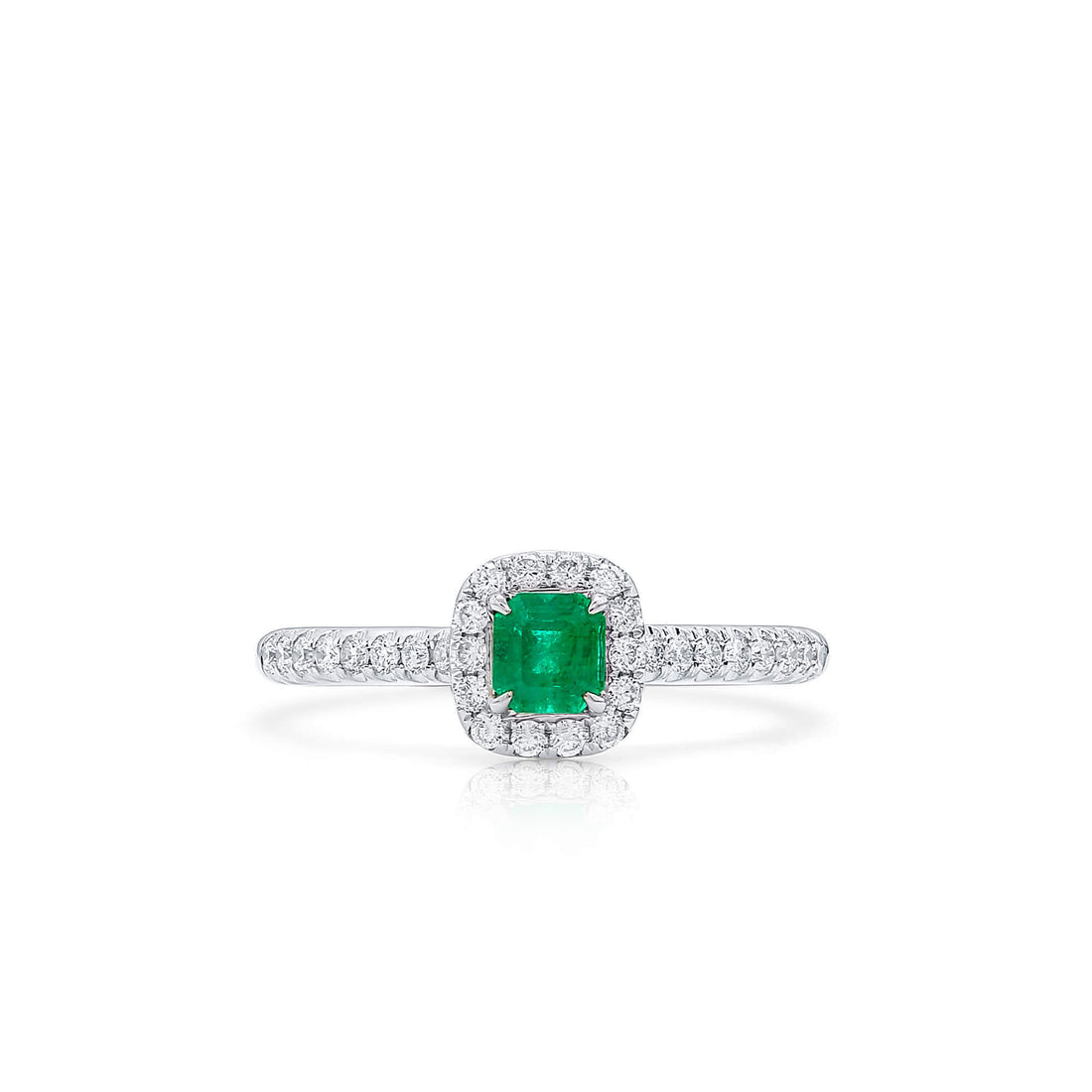 Natural Vivid Green Colombian Emerald Halo Ring 18K White Gold, Radiant Shape, 0.55 Ct. TW
