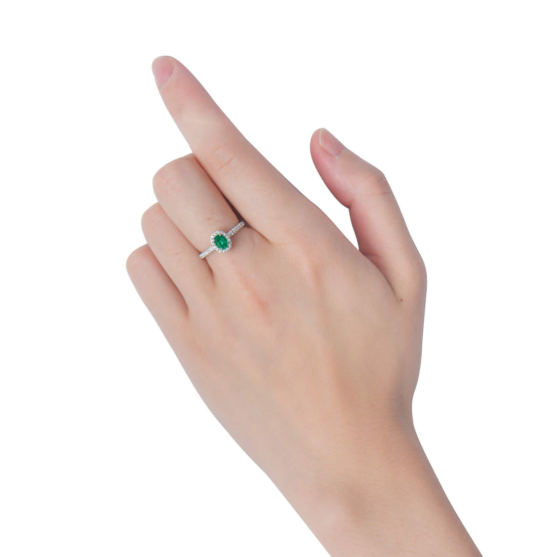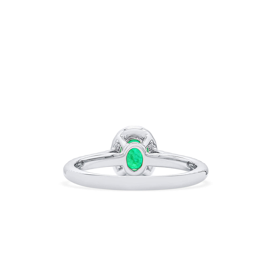 - Main stone weight of 0.41 Ct. with a vivid green oval emerald
