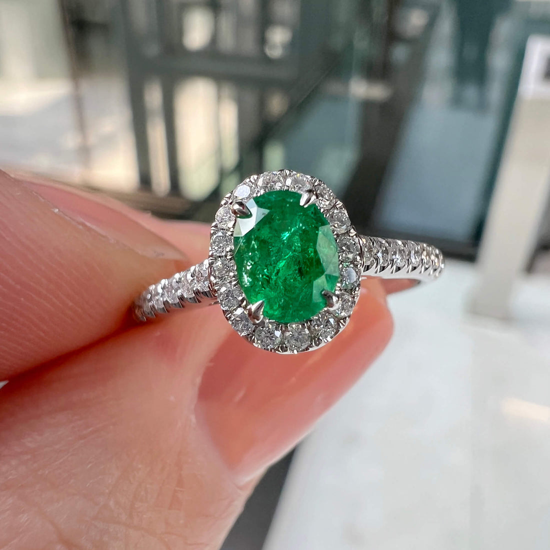 Natural Vivid Green Colombian Emerald Halo Ring